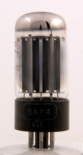 The 5AR4 is a compact high current full wave rectifier for use in high current small equipment. The compact size is in part achieved by the use of a pressed glass foot rather than a pinch. Essentially an all glass valve fitted on an IO base cap.
