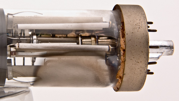The close-up of the tube neck showing the electron gun on the right and on the left the flaring Y plates are just visible.