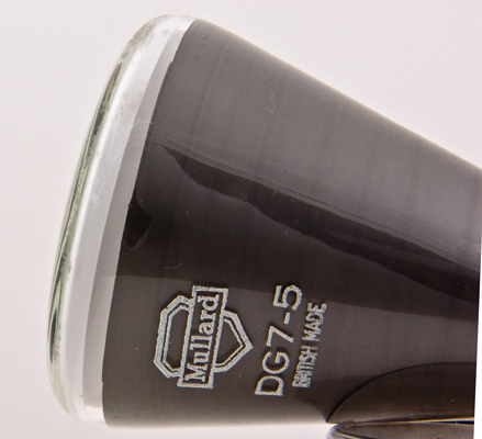 The DG7-5 is a small three inch electrostatically focused cathode ray tube. This was probably used for an oscilloscope type instrument. The phosphor is green and this tube came with different colour options for a range of applications.