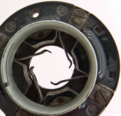 The pins rotate in the socket and are held between the ceramic side wall and the metal spring.