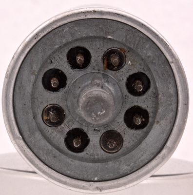The B8B or Loctal base. The spigot pushes out a spring in the valve holder and the spring drops into the groove thus holding the valve securely in its socket.The wide glass tube envelope is 31 mm in diameter, and excluding the B8B base pins is 69 mm tall.References: 3002. Type A1820 was first introduced in 1938. See also 1938 adverts. |