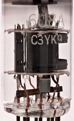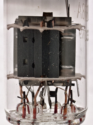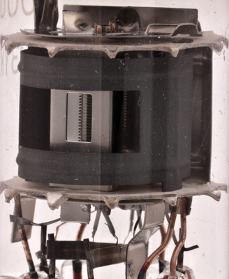 This image is taken looking into the pentode section. The working anode parts are to the left and right and carbonised to radiate heat. The centre bright component is the beam forming plate. Dead centre can be seen the screen grid wound on a bright support. The inner control grid is wound on copper supports.