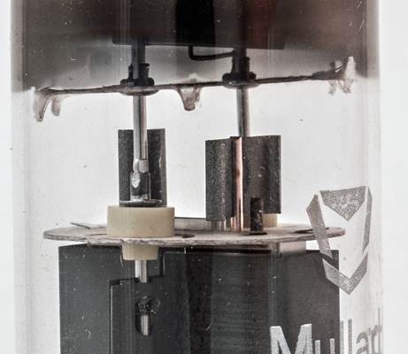 The anode seen along the grid axis. The support rods pass between the two halves of the anode plate. The grid heat sink fins can be seen above the top mica connected to the copper grid supports.