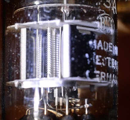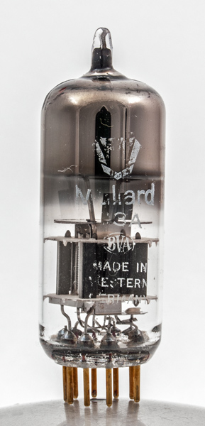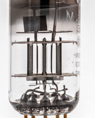 The working parts are small in relation to the envelope. The anode is split into two plates, one either side of the central cathode. Beyond the central cathode and grids and part way to the anode are the beam plates. Being Mullard these are referred to as grid three.