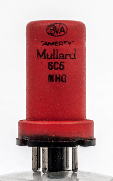 This Mullard metal valve is marked Amerty - a term used by Mullard for valves that they imported from the USA in the early 1940's. This was probably made by RCA and for the large order the Mullard red paint was sprayed onto the metal can.Type 6C5 disappeared from the lists fairly early because the design was superseded by the 6J5 which had slightly superior ratings and characteristics but was, for all practical purposes, a direct replacement.Most 6C5s were of the metal-envelope type whereas most 6J5s were 'GT/G' and therefore suitable for a wider range of applications. NB. Type 6SN7GT is two independent 6J5s in one envelope.