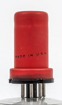 The reverse just carries the Made in USA lettering.The thin metal tube envelope is 25 mm in diameter and, excluding the IO base pins, is 50 mm tall.References: Data-sheet & 1040. Type 6C5 was first introduced in 1936. See also 1936 adverts. |