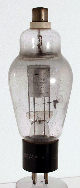 Strictly speaking the '10E/' and '110E/' designations added to the valve were WWII RAF Stores identities rather than valve types. No doubt boots, berets and ration packs all had identities in the same universal system. The valve shown above looks like an American Type 866 (MV) rectifier rated at 250 mA and 10 kV PIV.Visual inspection shows spots of mercury on the inside of the envelope and identifies this as a half wave mercury vapour rectifier. The spacing of the electrodes and the ceramic top cap insulator all point to a voltage rating of 1000 Volts plus.The classic envelope is 55 mm in diameter and, excluding the UX4 base pins, is 150 mm tall.References: Private Communication & data-sheet. Type 866 was first introduced in 1938. See also 1938 adverts. |