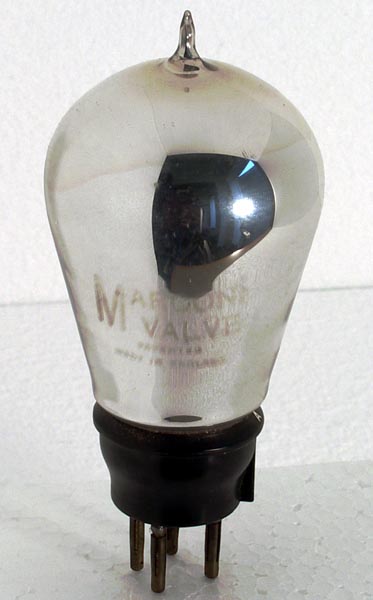 The DE4 is a rare valve, little used and not generally included in contemporary lists. Some collectors even doubt that the DE4 existed, but we have three in the museum. See DE4 for more information.We believe that this sample dates from 1925, based on the style of markings and the base. Earlier versions had a metal shell base cap.This triode is rated at 3.8 Volts filament voltage. This suggests accumulator supplies of 4 Volts nominal. The base is British four pin and the valve is marked with the BBC stamp.The balloon envelope is 59 mm in diameter and, excluding the B4 base pins, is 105 mm tall.References: 4051 & 1003 Type DE4 was first introduced in 1924. See also 1924 adverts. |