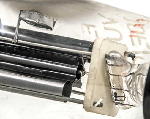 The high voltage dictates the use of ceramic insulators. The cathode tube is seen in the centre of the anode.