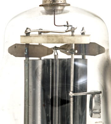 The cathode top support attaches to rods that are set at right angles to the anode supports for maximum separation.The classic envelope is 55 mm in diameter and, excluding the B4 base pins, is 122 mm tall.References: Data-sheet & Private communication. |