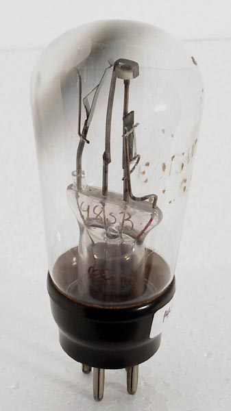 The DLS10 thermal delay switch very clearly shows the construction of the switch elements. The bi-metallic strip is heated by the filament (4 V) and at the correct temperature, and pre-set time (about 15 s), the switch contacts make and power can be applied to the protected device. Normally a mercury vapour rectifier.The 4 Volt heater suggests a 1930's origin of this design.The balloon envelope is 43 mm in diameter and, excluding the B4 base pins, is 94 mm tall.Reference: Data-sheet. |