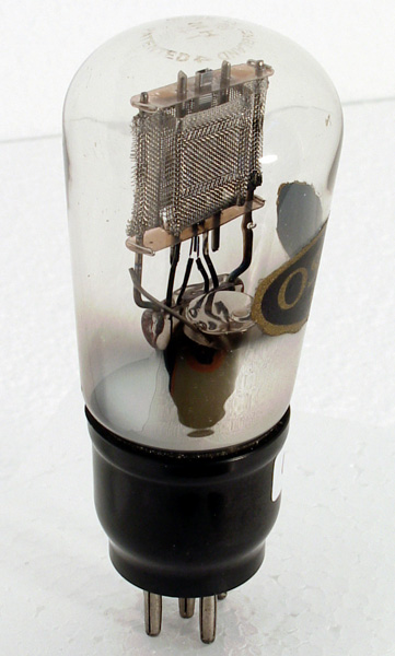 The MH41 is a mains triode that has the 1930s UK standard 4 Volt 1 Amp heater. The cathode assembly is a flattened tube and the grid is wound on notched rods. The anode is a bright mesh.The valve low impedance device and designed for audio frequencies.The MH41 was a souped-up MH4 and was M-OV's answer to the Mullard Type 994V as a high-gain detector triode. Unfortunately, by the time the MH41 hit the market the real need (for modern superhets) was for double-diode-triodes (eg. the M-OV MHD4, etc.).However, the MH41 saw service as an audio pre-amplifier and in professional applications. MH4s and early MH41s (such as illustrated) were inclined to be a bit hummy for high-gain use so a low-noise triode, the MH40, was also produced for professional users. Later MH41s were redesigned to reduce hum and noise and were used by the BBC and other professional organisations.The reason for the mesh anode is that fairly large amounts of gas are evolved when the coated cathode surface is activated during manufacture. Very much smaller amounts may be evolved when a valve is first used after a prolonged period of disuse. Making the electrode structure porous to gases helps evolved gas to flow away from the active regions of the valve and towards the pump stem or the internal getter, as the case may be. Even some modern valves have openings in the anode structure for similar reasons.The balloon envelope is 42 mm in diameter and, excluding the B5 base pins, is 100 mm tall.References: Data-sheet & 1040. Type MH41 was first introduced in 1933. See also 1933 adverts. |