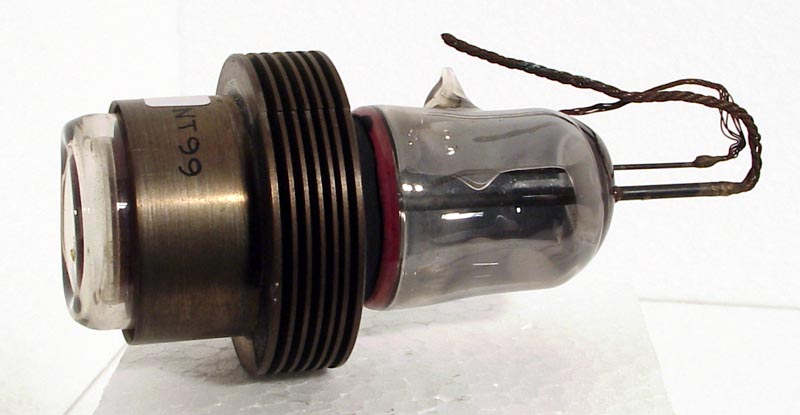 |  | The NT99 is a radar power triode or micropup and was designed for 50 cm operation and with a maximum anode dissipation of 150 Watts. This Type was the most widely used of the micropup pulsed triodes.It was used in the AMES11 600 MHz mobile ground radar used by the RAF. Fire control radar type 284 operating at 600 MHz and used by the Navy. For the 1941 Type 291 radar the modulator was the CV22. It was also used in the AI radar at 200 MHz.The construction is co-axial and the anode is finned to enable forced air cooling. The grid is connected via a depression in the envelope to the left of the picture.The valve is 52 mm in diameter, and excluding the base pins, is 95 mm tall.References: Data-sheet, 1005 & 3002. |