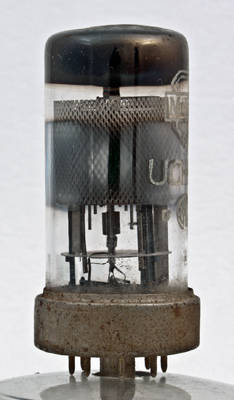 The UCH21 is an early example of all glass construction. This triode heptode frequency changer was designed to operate on a heater chain across the mains supply, and the anode voltage is correspondingly low to take account of the low HT voltage present in universal sets. Mullard describe the valve as designed to accept ACG to the heptode.