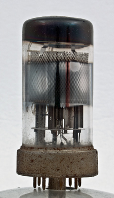 The triode sits below the heptode around the common central cathode. It is required to generate a peak to peak voltage of 13 Volts to drive the mixer correctly. The mesh screen obscures the heptode.