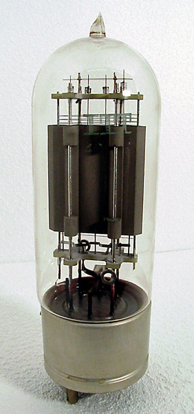 | | The valve looks like a late (1960s) specimen of the pre-war American Type 211. Valves of this type were at one time used professionally as audio modulators or sub-modulators.This valve was originally used by Radio Newcastle.It is a directly heated power triode with a special four pin base.The design purpose was as a high power audio amplifier.Reference: Observation. |
