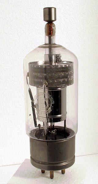 | | The VX2511 is a hydrogen thyratron. We think it is a triode. The large heat-shielded cathode is inside the lower metal cylinder while the mesh cage is the grid.Most EEV thyratrons of this class have FX numbers. The specimen looks externally similar to EEV type FX2517. If it is similar in specification, then it would be a triode with a peak power output of half a megawatt and a maximum forward voltage of 20 kV and a peak anode current of 350 Amps. The average current, however, would be limited to 350 mA.A new search for information in 2013 still revealed nothing specific.The wide glass tube envelope is 60 mm in diameter and, excluding the base pins, is 184 mm tall.Reference: Observation. |