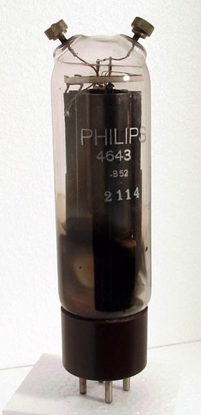 | | The 4643 is a power triode for audio and HF transmitting. The anode and control grid connections are screw caps that fit flush to the envelope. As screw caps for receiving valves come from the early 1930s it is probable that this is from the same period.Jim VK2WX/VK3OX/G4CGO, comments that his father used these valves in the 1930s and a pair of 4643s were used in large audio amps to deliver several hundred watts.The wide glass tube envelope is 60 mm in diameter and, excluding the base pins, is 180 mm tall.Reference: Observation. |