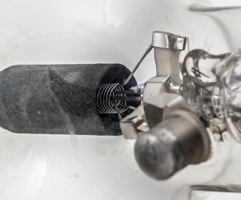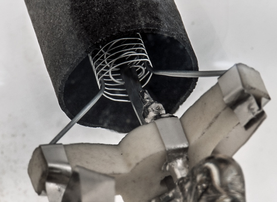 The anode with close wound grid. The grid supports are attached to the ceramic insulator.
