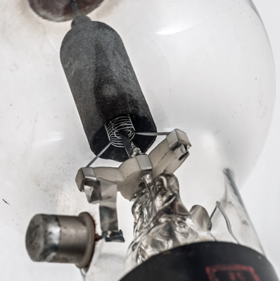 The 808 is a magnificent specimen. Built as the early triodes with a vertical anode, this valve was designed as an RF power amplifier or power oscillator. It can be used at full input up to 30 MHz and with reduced input up to 130 MHz. The filament is of thoriated tungsten and runs at 7.5 Volts and 4.0 Amps. The anode is substantial and glows cherry red at maximum input, the insulators are ceramic and the grid is connected to a side contact. The grid is a set of three support wires fixed to a ceramic spider, upon which the helical wire grid is wound. The maximum negative grid voltage is -400 Volts.