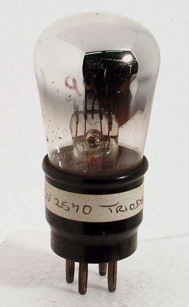|  | The CV2570 is a military marked 210HF. This battery triode was designed for HF use, and in those days a few MHz was high frequency. It is a receiver valve from the days of the TRF (tuned radio frequency) receiver.The balloon envelope is 40 mm in diameter and, excluding the B4 base pins, is 79 mm tall.References: Data-sheet & 1040. |