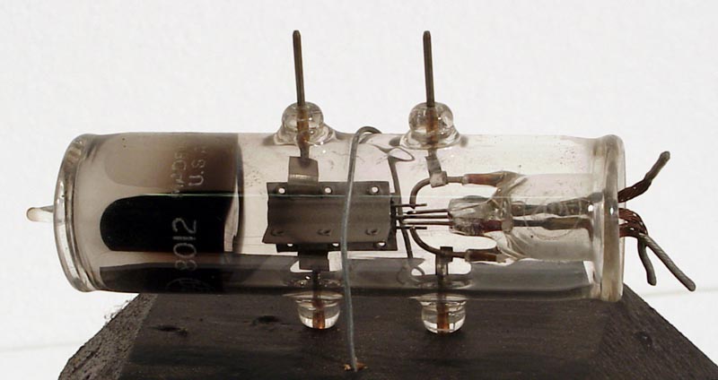 Type 8012 is a VHF/UHF transmitting triode dating from about 1942.The control grid can pass up to 14 mA grid current and dissipate 1.6 W. The maximum frequency of operation is in the region of 500 MHz.The anode is connected to one pair of side pins, the grid to another set of side pins.See also 8012 for more details and pictures.The thin glass tube envelope is 24 mm in diameter and, excluding the base pins, is 85 mm tall.References: Data-sheet & 3002. Type 8012 was first introduced in 1942. See also 1942 adverts. |