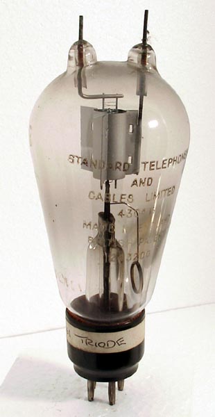|  | The 4304BB valve by STC is a VHF transmitting triode. The filament is just visible at the bottom of the anode cavity and is a spiral around the vertical rod that holds the wire and makes the return connection. The grid and anode are seen connecting to the top of the envelope by substantial supports.This is a lower power version of the 4304CB which has a carbon anode.The balloon envelope is 60 mm in diameter and, excluding the B4 base pins, is 140 mm tall.References: Data-sheet. |