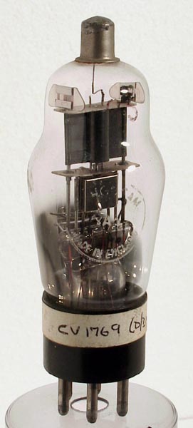 The 2A6 double diode triode is designed for detector and first audio stage in American radio receivers. The heater voltage of 2.5 Volts is unusual in the UK but a heater voltage of 2.5V was the original (late 1920s) standard for American indirectly-heated AC mains valves. The change to a 6.3V standard came about because of the demand (in the US) for car radios in the early and mid 1930s (most US cars at that time still had 6V electrical systems). The type 75 has the same UX6 base but a 6.3 Volt heater for this new market. Later the 6B6G was again the same valve but on an IO base and had a 6.3 Volt heater.This exhibit is a much later (post-War) replacement type branded Tungsram but probably factored. 2.5-volt valves were obsolete in the US by then but remained in demand for replacement purposes, eg. in South America. The interesting thing is that such a valve should have a CV number, particularly since it was essentially a US domestic radio type.The valve has a common cathode assembly, seen running vertically through the centre of the valve. The signal diode anodes are the bright plates seen in the centre of the envelope. Each side is insulated and forms a diode anode. The top of the electrode structure is the triode. The anode cavity is blackened.The classic envelope is 36 mm in diameter and, excluding the UX6 base pins, is 98 mm tall.References: Data-sheet, 1040, 1043 & 3002. Type 2A6 was first introduced in 1933. See also 1933 adverts. |