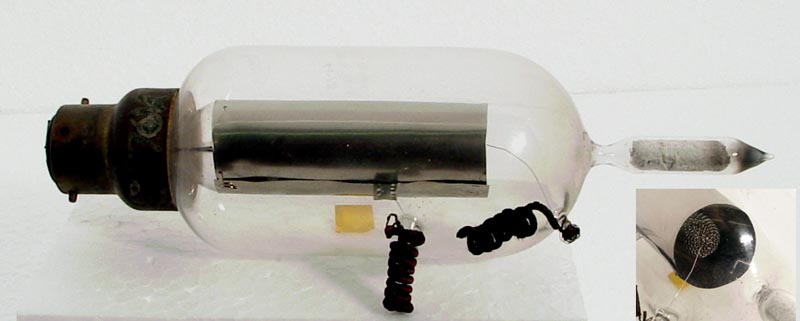 | | The N Marconi triode dates to 1914-15. The valve is described as soft with a 2 V 4 A filament. It has an asbestos pellet at the top as seen on the right of the picture. In the hands of skilled operators the pellet could be heated to give just the right amount of gas in the valve to achieve good sensitivity. In unskilled hands performance was poor. The advent of the hard vacuum valves changed the perception of how a valve operated and the R could be operated by unskilled operators. Thrower gives the filament current as 2.5 A and the anode potential as 40-80 Volts.The anode cylinder is brought out to a side connection and the grid is brought out nearer to the top. The grid is a close mesh wire cage as can be seen from the insert in the picture.The wide glass tube envelope is 46 mm in diameter and, excluding the base pins, is 170 mm tall.References: 1003 & 1005. Type N was first introduced in 1915. See also 1915  adverts. |