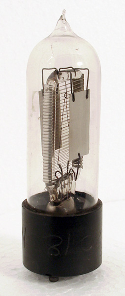 The CF185 is a De Forest triode.This triode was made during WWI for the Navy. This valve was not particularly suited to military use due to the fragility of the glass frame for the grid. The Western Electric VT-1 was better due to rugged construction.The base has three sub pins 3 mm long set at the points of an equilateral triangle. This was known as the 3-pin Navy Base. There is a pip on the side of the base to give locating details. Such pins are normally held in side entry spring clips.Within the envelope the anode consists of two rectangular plates held at three points each either side of the grid, and 4 mm away from the grid. The wire grid is formed on a notched rectangular glass support. The filament is a single strand formed into an inverted 'V'.Of the operating details of this bright emitter we only have that the filament current was not to exceed 0.85 Amps.The wide glass tube envelope is 28 mm in diameter and, excluding the base pins, is 103 mm tall.References: Private communication & 1047. Type CF185 was first introduced in 1915. See also 1915 adverts. |