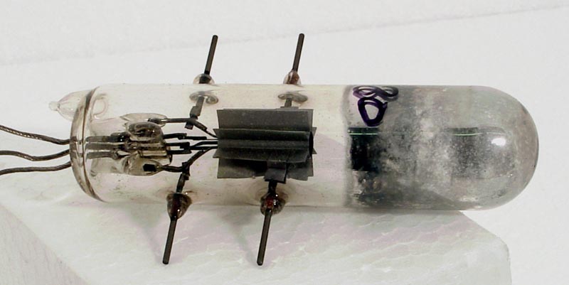 This valve is an experimental VHF type from the late 1930s.The anode is finned to radiate heat, at high frequencies the efficiency was very low, so a great deal of heat was generated. The anode and the grid are both taken to pairs of side pins on either side of the envelope. The grid is circular and surrounds the filament.This is possibly an early 8012, later versions were exhausted from the top. Alternativly the valve could be an early version of the 1628.The envelope is 25 mm in diameter and, excluding the base wires is 103 mm tall. Across the side pins is 60 mm tip to tip.Reference: Observation. Type Experimental was first introduced in 1917. See also 1917 adverts. |