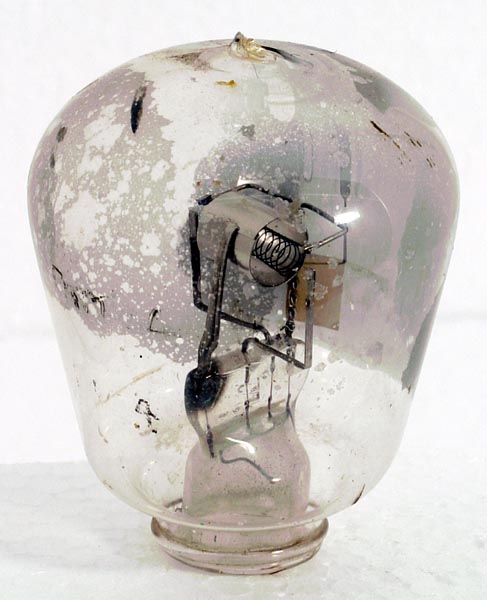 |  | This NR4C has lost its base, but the electrodes are still clearly seen within the envelope. The filament is a single strand running through the centre of the anode cylinder. Between the 9 mm diameter anode and the filament is a thick wire helical grid 3 mm in diameter.The NR prefix indicates that it was made for the British Navy as a receiving valve. The number 4 indicates that this was a very early device used by the Navy.The balloon envelope is 48 mm in diameter and, 66 mm tall.Reference: 1003. |