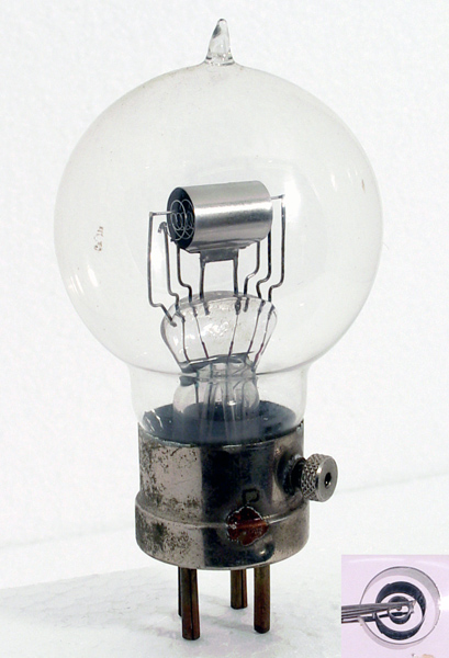 This beautiful valve is a very early double grid valve. Low voltage space charge grid valves originated in Germany with the SS1. The design operated so that the slightly positive first grid suppressed the space charge to improve sensitivity.Other two-grid valves were designed in the 1930's so that a signal and a local oscillator could be mixed together as in DG2 or 41MDG but these are not bi-grid valves in the same sense. Also the screened-grid valve S625 introduced in 1927, was not a bi-grid.The construction still follows the coaxial pattern within a horizontal cylindrical anode, but the fixing supports have become more formalised, and thus the parameters more consistent. The second grid is also a wire helix, but with far fewer turns than the first grid.The balloon envelope is 51 mm in diameter and, excluding the B4 base pins, is 88 mm tall.References: Observation & above article. Type Q(Bi-Grid) was first introduced in 1922. See also 1922 adverts. |