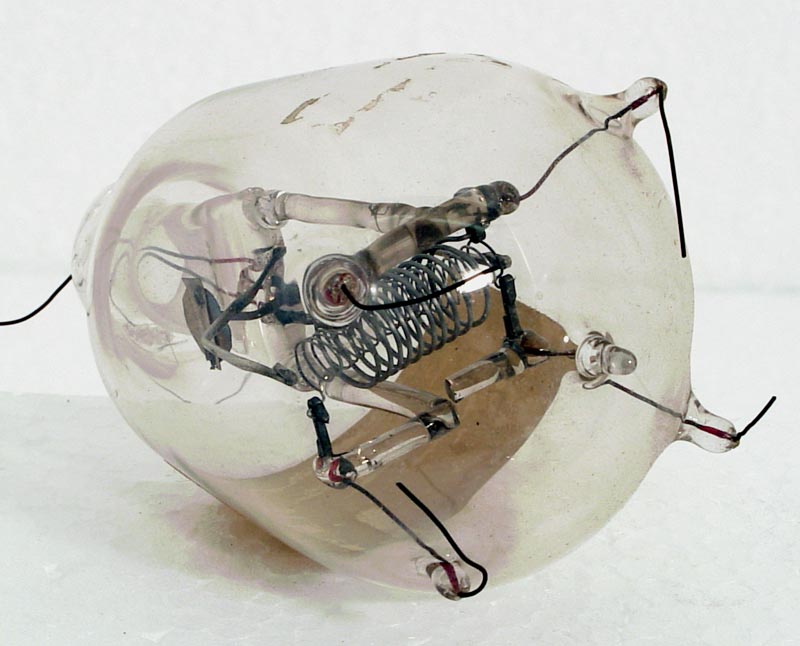 | | The BK oscillator valve dates to 1925 and it may never have had a proper type designation number. It appears to be experimental and was probably never fitted with a base.The filament is a single thin thread. The grid is a helical wire supported only by its ends, and both ends are brought out to separate top pins. Unusually the anode is also a helical wire. It too is supported only at the ends and again both ends are brought out to separate top pins.The Balloon envelope is 53 mm in diameter and, excluding the base pins, is 80 mm tall.Reference: Observation. Type BK was first introduced in 1925. See also 1925  adverts. |
