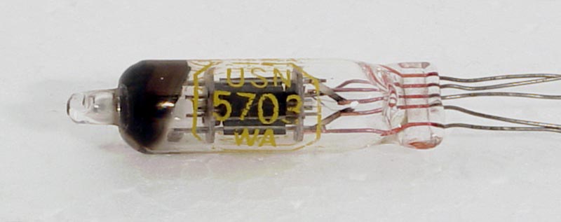 | | The 5703WA from Raytheon, is a post WWII experimental type.Some other subminiature valves in the '57' range are clearly for military purposes (Type 5768 is listed as a 'rocket triode'! Probably designed for use in proximity fuses.).One advantage of the very small size and weight is robustness to vibration and shock. Such a small valve would get very hot at the ratings indicated but it might not be required to operate for more than a few seconds.The thin glass tube envelope is 9 mm in diameter and, excluding the base pins, is 38 mm tall.References: Data-sheet. |