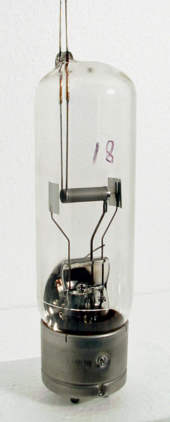 | | The NT1 interesting exhibit. It features a single thread filament, and cylindrical anode. The latter is split along its length and both halves are taken to top pins. This suggests some form of early magetron and we believe that it dates from 1938-9. The far end of the anode is taken to one of the four base pins.This is not the NT1 first UK Navy transmitting valve.The wide glass tube envelope is 40 mm in diameter and, excluding the four lock-in base pins, is 210 mm tall.Reference: Observation. |