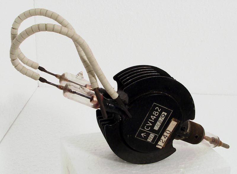|  | The CV1482 magnetron is seen without support cradle or magnet. The filament connections are the flying leads seen on the left. The anode connects to the right terminal, pictured past the output probe.The basic magnetron is a fixed frequency device and this design was made in four variants (CV1479-82) to cover different frequencies.The KB/Q identifies this valve as being made to specification K1001 or K1006, the B denotes qualification by a UK authority and the Q identifies the maker as English Electric Valve Co., Chelmsford.See CV1481 for details.The envelope is 75 mm in diameter and, excluding the base pins, is 190 mm tall, and 35 mm front to back.Reference: Data-sheet. |