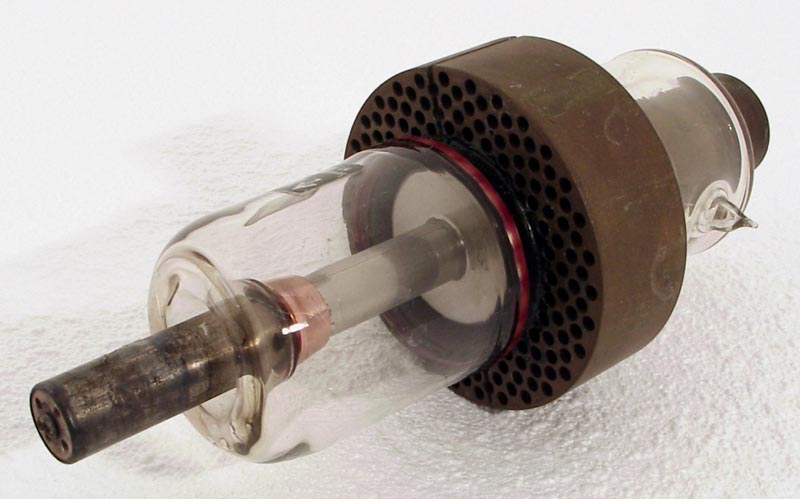 |  | The CV240 pulse transmitting triode has a peak output power of 1000 Watts. The peak current is 67 Amps, but the mean current is 17.78 mA. The full power frequency of operation was 80-90 MHz and could be used at higher frequencies with reduced output.The ACT24 micropup was an M-OV development during WWII and given a CV designation.The cooling collar is 84 mm in diameter and 31 mm thick.The envelope is 54 mm in diameter and, excluding the base pins, is 225 mm tall.References: Data-sheet & 1005. |