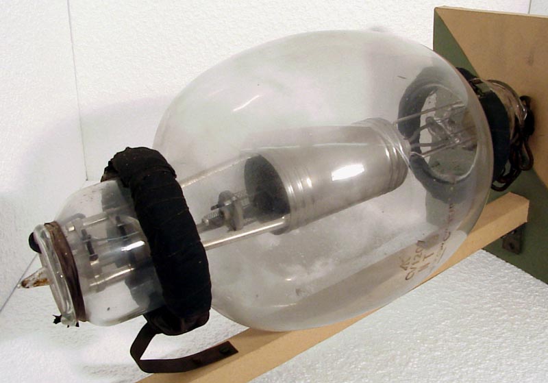 |  | The CV1207 transmitting triode dates from 1933. The envelope also carries the designation NT19.The valve is rated at 450 W output power, and is radiation cooled. The filament is a single thread of pure tungsten formed into an inverted 'V', and sprung loaded at the top. The grid is a wire helix and it can be seen extending beyond the enclosing anode cylinder. The anode is not substantial or blackened to assist radiating away the heat generated by the electron bombardment.The balloon envelope is 150 mm in diameter and, excluding the base pins, is 330 mm tall.Reference: Data-sheet. Type CV1207 was first introduced in 1933. See also 1933  adverts. |