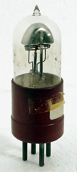 The anode is a flattened parabolic hood with a bright finish. The control grid is a series of wire loops attached to a flattened metal ring, seen under the anode hood. The B4 base is 31 mm in diameter.