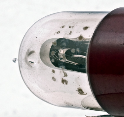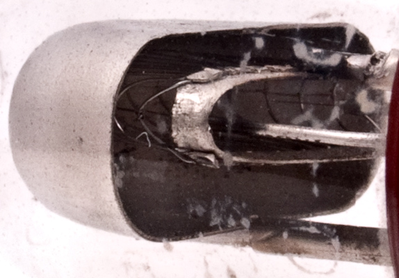 The etched lettering has the patent details on one side of the envelope and the type designation on the other side. In addition to P1 lettering gives filament voltage 3.5 - 4.0 Volts and anode voltage 20 - 80 Volts. Looking into the anode bell the grid wires on the support can be seen to form a cage. The thicker supports in the centre are for the arched filament.