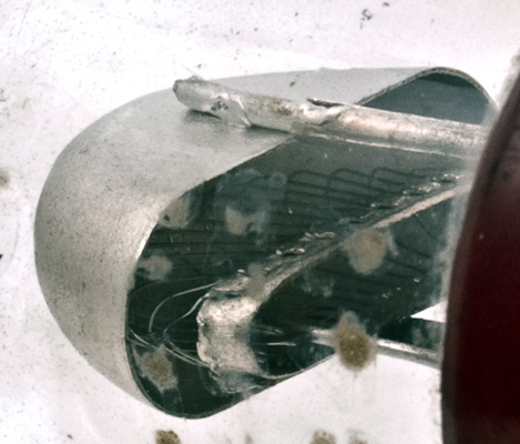 The unique feature of the P1 and P2 (which looked identical except that one had its top dipped in red paint) was that the filament was self-sprung in the form of a semi-circular bow, following the 'hooded' form of the anode. The grid also followed the same hooded shape. This arrangement not only avoided the need of a filament tensioning spring but also side-stepped patents covering the 'French' construction arrangement used in the Type R and many other early 'brights'.