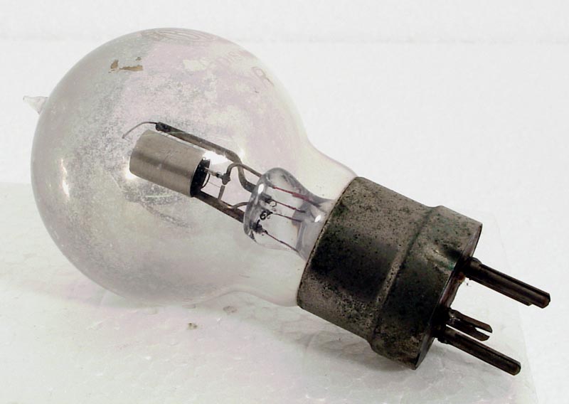 This is a version of the Type R made by Ediswan for the domestic radio market in around 1923 (note the large style of BBC stamp). Most later Ediswan Rs for the domestic market were tubular and gettered, and were sold as Type AR. In order to fit the electrodes into a tubular glass envelope no wider than the base cap it was necessary to redesign the structure in a vertical format. This exhibit exemplifies only the first stage of the redesign process and probably comes from a batch intended to test the new filament tensioning system 'under field conditions' (ie by selling them to unsuspecting customers and waiting to see whether anyone screamed. The Type AR version sold well and survives in some quantity although rarely with filament intact.This triode was used by the RAF. It is unusual in an R type in that the electrode assembly is held vertically. Also the supports are neat and minimal.The envelope is partially silvered inside, and demonstrates that the valve is gettered. The filament is a single thread and is spring loaded. The grid is a bright wire helix fixed to a single vertical rod support. The anode is a bright cylinder fixed to the pinch by a single stout support.The base pins are of unequal length and this arrangement forms the Ediswan safety cap. See ARDE for details.The balloon envelope is 52 mm in diameter, and excluding the B4 base pins, is 94 mm tall.References: Private correspondence, box & 1003 Type R Type was first introduced in 1916. See also 1916 adverts. |