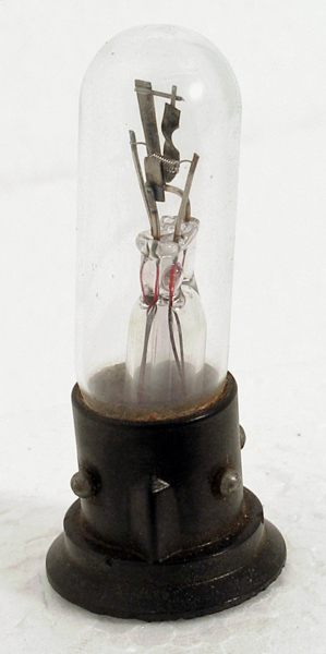 This exhibit is a thermal delay switch, used to delay the application of anode volts until associated valves had time for the cathodes/filaments to reach operating temperature.This looks like one of the peculiar little Ediswan devices used in 'Metrovick' AC Mains Adapter units marketed around 1930 to enable owners of domestic battery radios to operate their existing sets from the (newly installed) AC mains which was at that time spreading rapidly.In addition to a multi-winding mains transformer, these Adapter units included an HT rectifier giving around 100 to 120V DC, and a gas-filled (argon?) LT rectifier. When 'ON' the radio set operated from its own LT accumulator but with HT supplied by the Adapter; when 'OFF', the Adapter trickle-charged the LT accumulator by means of the LT rectifier. A device similar to this exhibit was fitted into the Adapter (black base cap upwards) and may have been a delay switch for the LT rectifier.The coiled filament is clearly visible as is the bi-metallic strip.The wide glass tube envelope is 17 mm in diameter and, excluding the base pins, is 68 mm tall.References: Observation & private communication. |