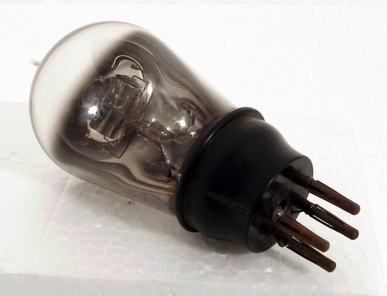 | | This Osram DE6 dull emitter battery triode dates from 1925. It is suited to amplification of audio to drive a loud speaker.The construction is a classic horizontal coaxial configuration. The filament, rated at 1.8V is a single straight wire at the centre of the bright anode cylinder. The grid is a fine wire helix that is attached to a support rod. The rod is fixed at both ends and the grid stands on and above the support.The balloon envelope is 43 mm in diameter and, excluding the B4 base pins, is 90 mm tall.References: 4051 & 1003 Type DE6 was first introduced in 1924. See also 1924  adverts. |