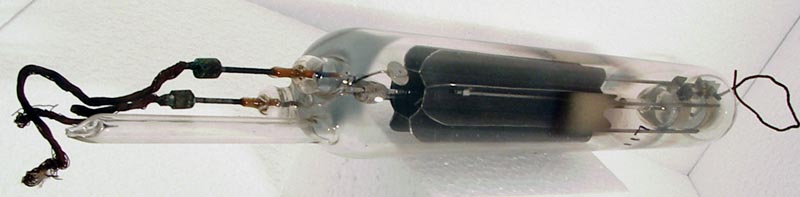| | The T311 rectifier dates from 1942.The anode 116 mm long and 38 mm in diameter, is blackened to facilitate radiation cooling, and formed with eight fins for greater surface area. The filament is helical and runs through the length of the anode cavity.The wide glass tube envelope is 45 mm in diameter and, excluding the base pins, is 376 mm tall.Reference: Observation. Type T311 was first introduced in 1942. See also 1942  adverts. |