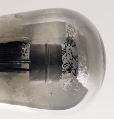 Within the anode is the cathode. The filament is broken.The balloon envelope is 50 mm in diameter and, excluding the UX4 base pins, is 117 mm tall.References: Data-sheet & private communication. |