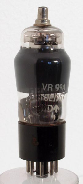 |  | The VR99A is a triode hexode, and the VR denotes that it was designated for use with the RAF as a receiver device.The triode was designed for local oscillator use and an injection voltage of 10 V peak to peak was produced. The hexode mixer took the signal into the top cap grid, thus maintaining the greatest separation between grid and anode circuits.The VR99 was selected from X65 production and given the Type designation of X66. The VR99A, later renamed CV1581 was a clear envelope triode hexode and based on the Mullard ECH35.The classic envelope is 37 mm in diameter and, excluding the IO base pins, is 94 mm tall.References: Data-sheet & 3002. Type VR99A was first introduced in 1940. See also 1940  adverts. |