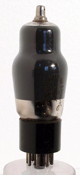 The X63 heptode mixer is typical of the 1930/1940s frequency changer. The triode oscillator is formed between the cathode and g2 acting as an anode, and has to generate a peak to peak voltage of 25 Volts. The mixer is screened by G3 and G5 with the signal injected into the oscillating electron stream at the top cap g4.The envelope has the etched identification lozenge typical of an M-OV product. Our other X63 has a clear glass envelope.The classic envelope is 36 mm in diameter and, excluding the IO base pins, is 98 mm tall.References: Data-sheet, 1040 & 1043. Type X63 was first introduced in 1937. See also 1937 adverts. |