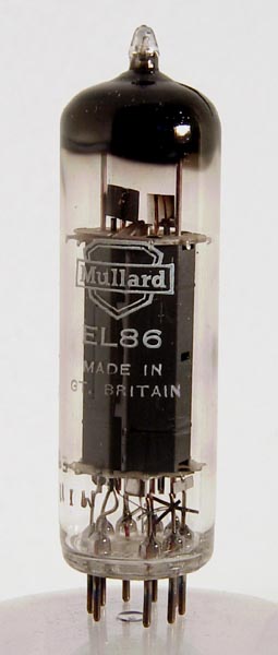 The EL86 is an output pentode with an anode dissipation of 12 Watts. The EL86 is designed for a higher anode current and lower anode voltage than the EL84. This would suit transformerless designs of the type called single ended push pull see data-sheet. It was also specified for use as a series regulator.The thin glass tube envelope is 20 mm in diameter and, excluding the B9A base pins, is 68 mm tall.References: Data-sheet & 1040. Type EL86 was first introduced in 1956. See also 1956 adverts. |